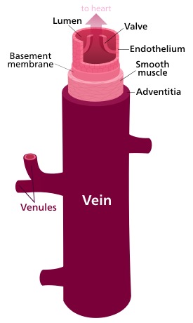 The intricate networks formed by the capillaries eventually converge to form venules, (small veins). The venules then converge to form veins which return the blood to the heart. Vein walls only consist of two layers. The outer layer is made up of connective tissue whereas the inner layer is made up of endothelial cells.