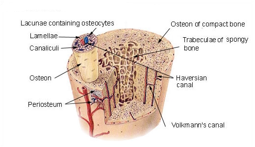 Each Haversian canal is surrounded by concentric rings of compact bone called lamellae. Each of these layers contains a ring of fluid-filled cavities called lacunae. Each of these lacuna will contain a number of bone cells called osteocytes. The lacunae are linked to each other and to the Haversian canal by a system of very tiny interconnecting canals called canaliculi. Strands of cytoplasm extend through these canals which supply the osteocytes with oxygen and nutrients and remove waste products. The Haversian canals, lacunae, osteocytes and canaliculi together form a unit called an Haversian System and a number of these systems make up compact bones.