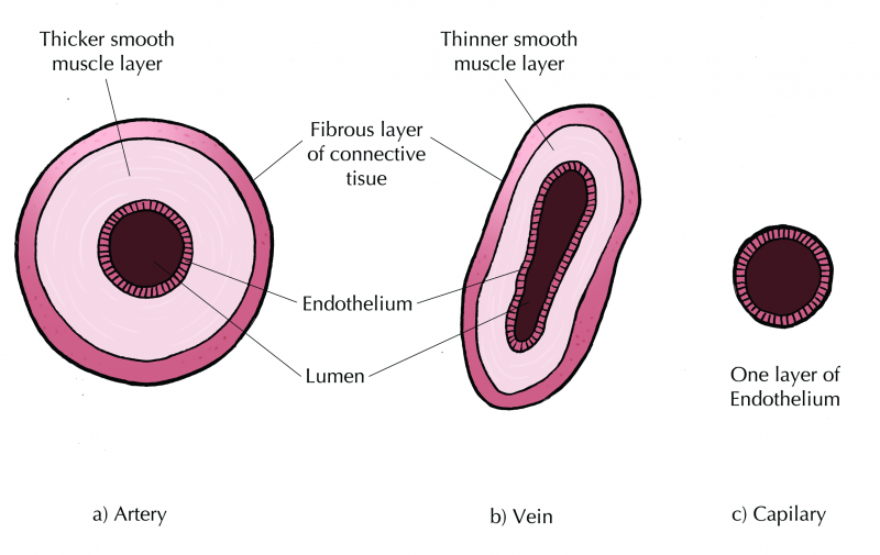 Cross-section showing the differences between a) arteries, b) veins and c) capillaries.