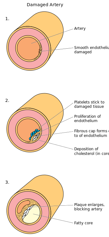 1. Normal arteries have a wide diameter through which blood can easily flow. 2. Plaque forms on the walls of the artery, narrowing the lumen. 3. When the plaques bursts, platelets form a blood clot at the site of rupture, which can obstruct the artery.