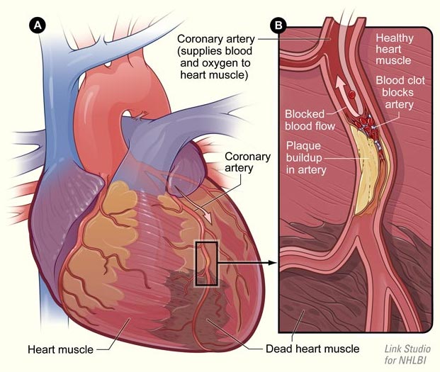 This is also referred to as a myocardial infarction. Heart muscles are provided with oxygenated blood by a system of coronary arteries. Blocked flow of blood can cause the death of cardiac muscle due to lack of oxygen. Arteries get blocked as a result of the gradual build-up of lipids and cholesterol, which form a plaque. This condition of plaque build up in the arteries is referred to as atherosclerosis. When a plaque bursts, it causes blood to clot at the site of the rupture and obstructs the artery. Often there are no symptoms of atherosclerosis. However, some people who have narrowed coronary arteries experience chest pain, (angina), when blood flow to the heart is insufficient.