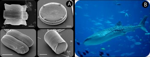 Tiny diatoms and whale sharks are all made of cells. Diatoms are about 20 µm in diameter and are made up of one cell, whereas whale sharks can measure up to 12 meters in length and are made up of billions of cells. Credit: (a) Mary Ann Tiffany, San Diego State University (CC BY 2.5) (b) Flickr:istolethetv (CC BY 2.0)