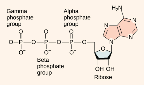 ATP is the primary energy currency of the cell. It has an adenosine backbone with three phosphate groups attached. Image Attribution: OpenStax Biology