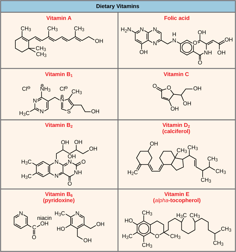 Vitamins are important coenzymes or precursors of coenzymes, and are required for enzymes to function properly. Multivitamin capsules usually contain mixtures of all the vitamins at different percentages. Image credit: OpenStax Biology