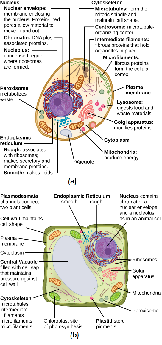 These figures show the major organelles and other cell components of (a) a typical animal cell and (b) a typical eukaryotic plant cell. The plant cell has a cell wall, chloroplasts, plastids, and a central vacuole—structures not found in animal cells. In fact, plant cells do not have lysosomes or centrosomes. Image Attribution: OpenStax Biology