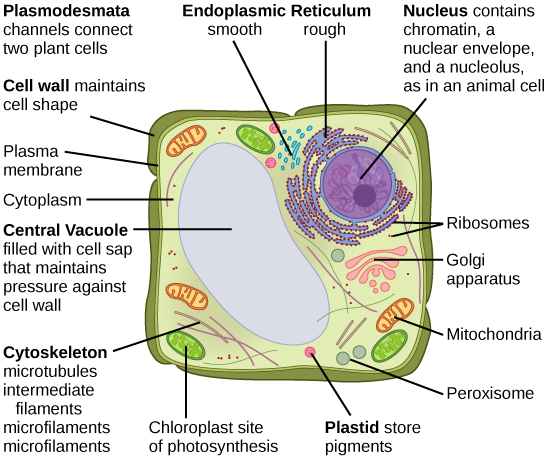 Recall that vacuoles are essential components of plant cells. If you look at the plant cell diagram above, you will see that plant cells each have a large central vacuole that occupies most of the area of the cell. The central vacuole plays a key role in regulating the cell’s concentration of water in changing environmental conditions.