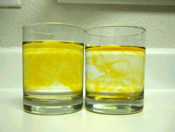 In the animation above, you can see yellow food coloring spreading in water. The glass on the left contains hot water, while the glass on the right contains cold water. The food coloring was added to the cold water slightly before the coloring was added to the hot water, yet after a few seconds it has spread more thoroughly in the hot water.