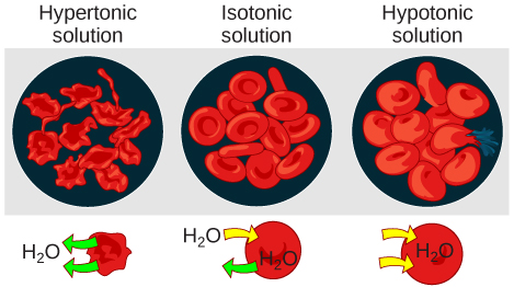 Three terms—hypotonic, isotonic, and hypertonic—are used to relate the osmolarity of a cell to the osmolarity of the extracellular fluid that contains the cells. In a hypotonic situation, the extracellular fluid has lower osmolarity than the fluid inside the cell, and water enters the cell. (In living systems, the point of reference is always the cytoplasm, so the prefix hypo- means that the extracellular fluid has a lower concentration of solutes, or a lower osmolarity, than the cell cytoplasm.) It also means that the extracellular fluid has a higher concentration of water in the solution than does the cell. In this situation, water will follow its concentration gradient and enter the cell.