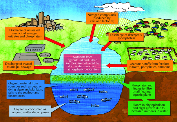 Using large amounts of fertilisers can be harmful to the environment. Fertilisers wash off into rivers where they are poisonous to plant and animal life. The accumulation of fertilisers in rivers can lead to a process known as eutrophication. This process occurs when excessive nutrients (nitrates and phosphates) from the land (typically from fertilisers) run off into rivers and lakes. This leads to high growth of water plants. Plants grow and produce food by photosynthesis which requires high quantities of oxygen.