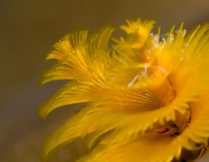 It is actually the Yellow Christmas tree worm. These animals are colorful, and can be red, orange, yellow, blue, and white. The Christmas tree worm lives on tropical coral reefs throughout the world. The Christmas tree worm's plumes are used for feeding and respiration. These worms use their plumes to catch plankton and other small particles passing in the water. Cilia then pass the food to the worm's mouth.