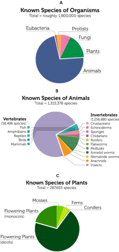 Biodiversity refers to the variety of life and its processes, including the variety of living organisms, the genetic differences among them, and the communities and ecosystems in which they occur. Scientists have identified about 1.9 million species alive today. They are divided into the six kingdoms of life shown in the figure below. Scientists are still discovering new species. Thus, they do not know for sure how many species really exist today. Most estimates range from 5 to 30 million species.