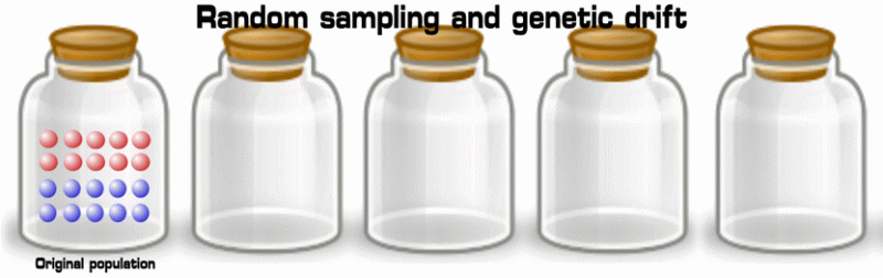 Another way a population’s allele and genotype frequencies can change is genetic drift (see the figure below), which is simply the effect of chance. By chance, some individuals will have more offspring than others—not due to an advantage conferred by some genetically-encoded trait, but just because one male happened to be in the right place at the right time (when the receptive female walked by) or because the other one happened to be in the wrong place at the wrong time (when a fox was hunting).