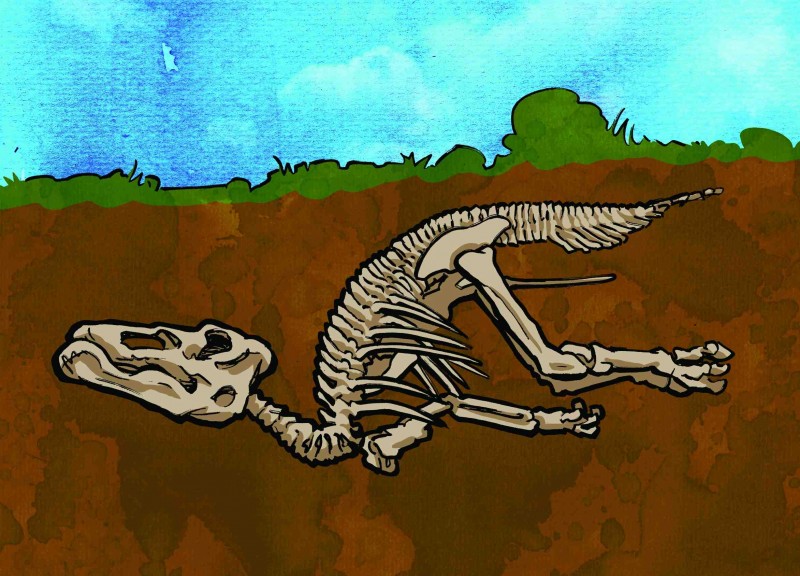 Heavy rains gradually washed in enough sand and gravel to bury her bones. These deposits built up over thousands of years, burying her remains hundreds of metres deep. The calcium in her bones, molecule by molecule, was replaced by minerals from these deposits, turning the bones to stone.