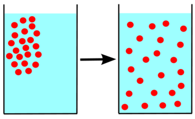 Diffusion is the movement of substances from a region of high concentration to low concentration. It is therefore said to occur down a concentration gradient. The diagram below shows the movement of dissolved particles within a liquid until eventually becoming randomly distributed.