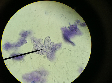- Spread the moist film on a drop of water on a clean glass slide, creating a small smear on the slide.