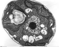 Chlamydomonas reinhardtii, a single celled green algae, as seen under the transmission electron microscope. |