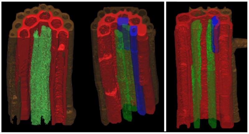 Stained root tissues as visualised by confocal microscopy. Colour key: brown, epidermis; red, cortex; blue, endodermis; green, pericycle.