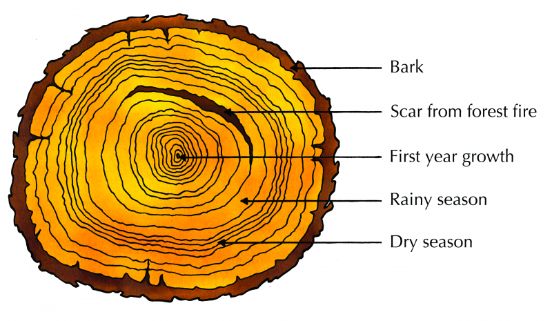 Every year a tree forms a new layer of xylem around the trunk. This forms tree rings, which are visible as circles in a cross section of a tree that has been cut down. Each tree ring, or wood layer, consists of two colours of wood; light wood that grows in spring and summer and dark wood that grows in autumn and winter. Tree rings can be counted to give you a rough estimate of the age of a tree. Occasionally a tree will form many rings in one year or miss forming rings in a year. The width of the tree rings is greater in years where good growing conditions occur. In years with droughts or low temperatures, the trees will produce narrower rings. Therefore, by looking at the tree rings you can get an idea of the weather affecting a tree in a particular year. Scientists can use this information to help determine the weather patterns of the past as well as events such as forest fires, earthquakes, and volcanic eruptions. The study of past events using the growth rings of trees is known as dendrochronology (dendros = tree, chronos = time).