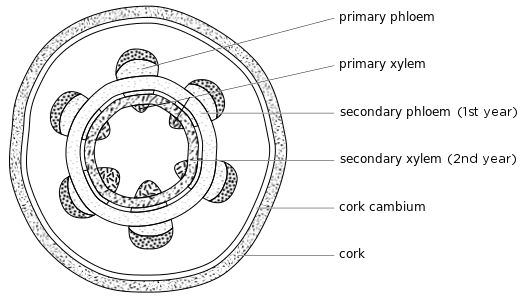 Secondary growth is seen clearly if you examine the stump of a tree. During every growing season the stem of a plant increases in width. This is known as secondary thickening. Towards the end of the first year of growth, the parenchyma cells between the vascular bundles become meristematic. This means that they actively start dividing by mitosis, and link up with the cambium that occurs in the vascular bundles to form a cambium ring in the stem (see the figure below). The cells in the cambium ring start dividing to form secondary phloem (on the outside of the cambium ring) and secondary xylem (on the inside of the cambium ring). Each year another ring of secondary phloem and secondary xylem is formed, making the stem grow wider.