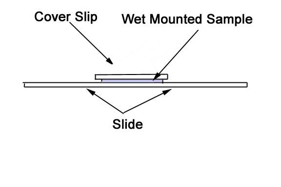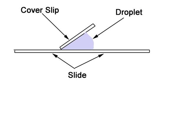 - Place the coverslip next to the droplet, as shown in the diagram, then lower it slowly onto the glass slide. This will prevent bubbles forming under the coverslip. You can use a dissecting needle to lower the the coverslip into position. The drop will spread outward and suspend the sample between the slide and the coverslip.