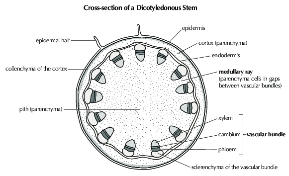 The figure below shows a schematic arrangement of tissues in a dicotyledonous stem. Details of each tissue type are described in this section.