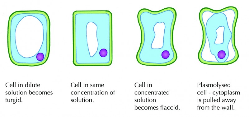 Plants need water to maintain turgor pressure. Turgor pressure is what provides the plant with much of its structural support. Have a look at the figure below which shows the effect of osmosis on the turgidity of cells.