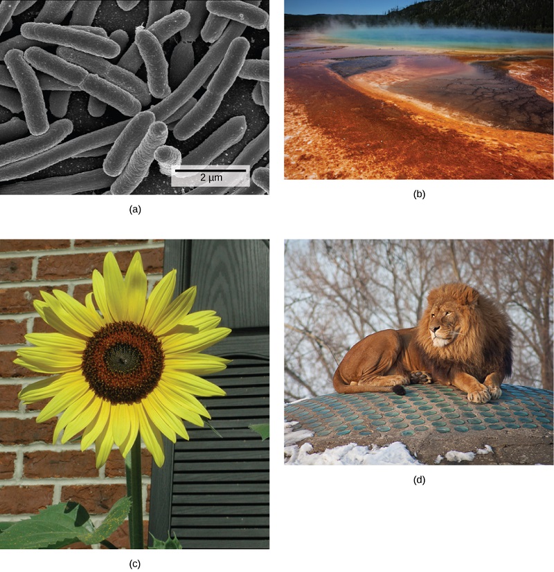 These images represent different domains. The (a) bacteria in this micrograph belong to Domain Bacteria, while the (b) extremophiles (not visible) living in this hot vent belong to Domain Archaea. Both the (c) sunflower and (d) lion are part of Domain Eukarya. Image Attribution: a:- modification of work by Drew March; b:- modification of work by Steve Jurvetson; c:- modification of work by Michael Arrighi; d:- modification of work by Leszek Leszcynski
