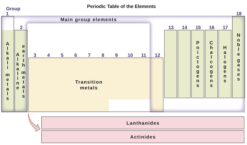 The periodic table organizes elements with similar properties into groups. Image credit: OpenStax, Chemistry