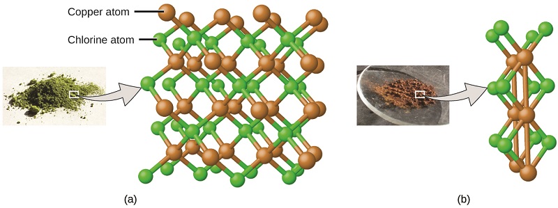 Compared to the copper chlorine compound in (a), where copper is represented by brown spheres and chlorine by green spheres, the copper chlorine compound in (b) has twice as many chlorine atoms per copper atom. Image credit:- OpenStax, Chemistry; a: modification of work by “Benjah-bmm27”/Wikimedia Commons; b: modification of work by “Walkerma”/Wikimedia Commons