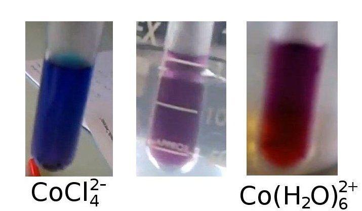 \[\underset{\color{blue}{\text{blue}}}{\underbrace{{\color{blue}{{\text{CoCl}}_{4}^{2-}\text{(aq)}}}}} + 6{\text{H}}_{2}{\text{O(l)}} \leftrightharpoons \underset{\color{red}{\text{pink}}}{\underbrace{{\color{red}{{\text{Co(H}}_{2}{\text{O)}}_{6}^{2+}\text{(aq)}}}}} + 4{\text{Cl}}^{-}\text{(aq)}\]