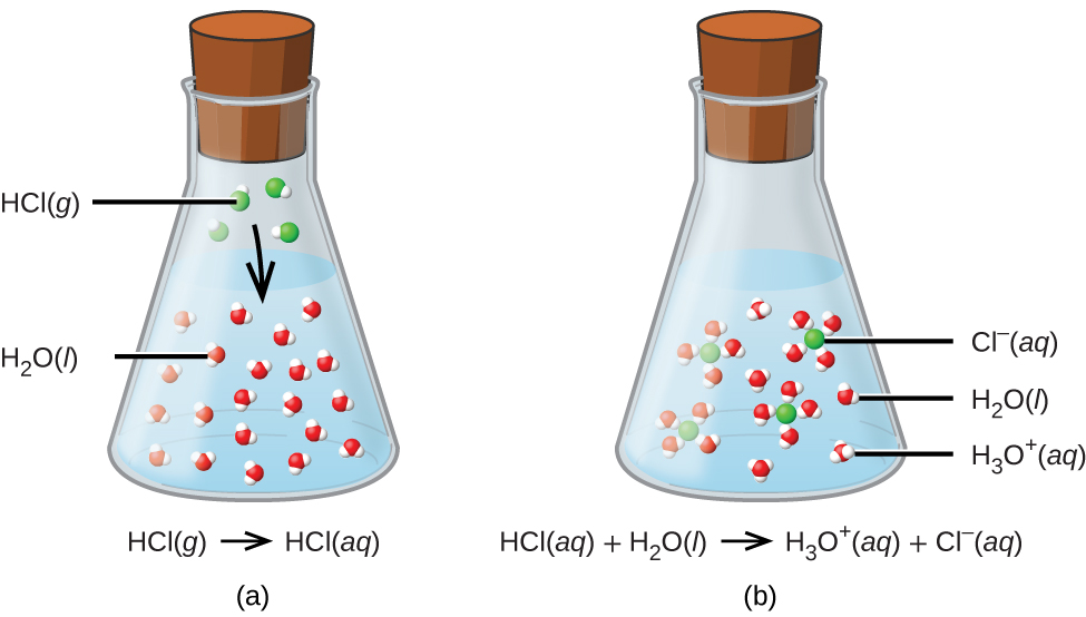 When hydrogen chloride gas dissolves in water, (a) it reacts as an acid, transferring protons to water molecules to yield (b) hydronium ions (and solvated chloride ions). Image credit: OpenStax, Chemistry