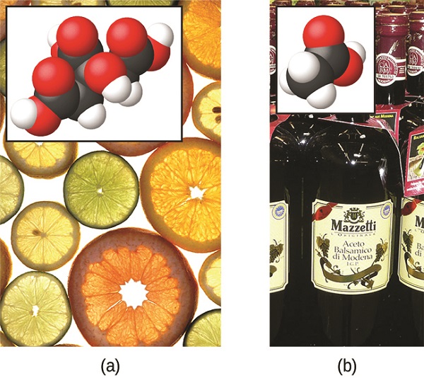 (a) Fruits such as oranges, lemons, and grapefruit contain the weak acid citric acid. (b) Vinegars contain the weak acid acetic acid. Image credit:- a: modification of work by Scott Bauer; b: modification of work by Brücke-Osteuropa/Wikimedia Commons