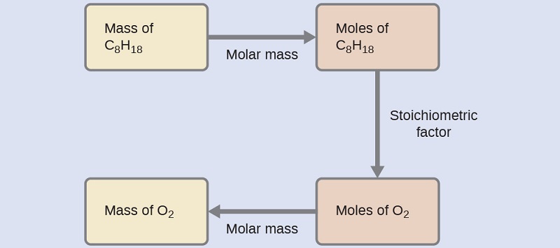 \(\require{cancel}\mathrm{702 \; \cancel{g \; C_8H_{18}}} × \cfrac{\mathrm{1 \; \cancel{mol \; C_8H_{18}}}}{\mathrm{114.23 \; \cancel{g \; C_8H_{18}}}} × \cfrac{\mathrm{25 \; \cancel{mol \; O_2}}}{\mathrm{2 \; \cancel{mol \; C_8H_{18}}}} × \cfrac{\mathrm{32.00 \; \cancel{g \; O_2}}}{\mathrm{\cancel{mol \; O_2}}} = 2.46 × 10^3 \mathrm{\; g \; O_2}\)