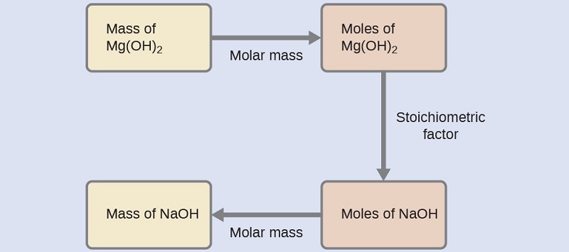 \(\require{cancel}\mathrm{16 \; \cancel{g \; Mg(OH)_2}} × \cfrac{\mathrm{1 \; \cancel{mol \; Mg(OH)_2}}}{\mathrm{58.3 \; \cancel{g \; Mg(OH)_2}}} × \cfrac{\mathrm{2 \; \cancel{mol \; NaOH}}}{\mathrm{1 \; \cancel{mol \; Mg(OH)_2}}} × \cfrac{\mathrm{40.0 \; \cancel{g \; NaOH}}}{\mathrm{\cancel{mol \; NaOH}}} = \mathrm{22 \; g \; NaOH}\)