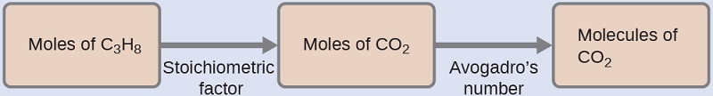 \(\require{cancel}\mathrm{0.75 \; \cancel{mol \; C_3H_8}} × \cfrac{\mathrm{3 \; \cancel{mol \; CO_2}}}{\mathrm{1 \; \cancel{mol \; C_3H_8}}} × \cfrac{6.022 × 10^{23} \mathrm{\; CO_2 \; molecules}}{\mathrm{\cancel{mol \; CO_2}}} = 1.4 × 10^{24} \mathrm{\; CO_2 \; molecules}\)