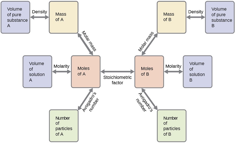 Regardless of the details, all these calculations share a common essential component: the use of stoichiometric factors derived from balanced chemical equations. The figure provides a general outline of the various computational steps associated with many reaction stoichiometry calculations.
