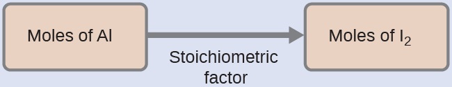 Referring to the balanced chemical equation, the stoichiometric factor relating the two substances of interest is \(\frac{3\text{ mol }\mathrm{I_2}}{2\text{ mol Al}}.\) The molar amount of iodine is derived by multiplying the provided molar amount of aluminum by this factor: