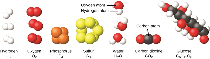 The elements hydrogen, oxygen, phosphorus, and sulfur form molecules consisting of two or more atoms of the same element. The compounds water, carbon dioxide, and glucose consist of combinations of atoms of different elements. Image credit: OpenStax, Chemistry