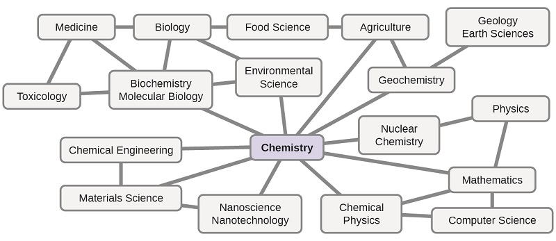 Knowledge of chemistry is central to understanding a wide range of scientific disciplines. This diagram shows just some of the interrelationships between chemistry and other fields. Image credit: OpenStax Chemistry