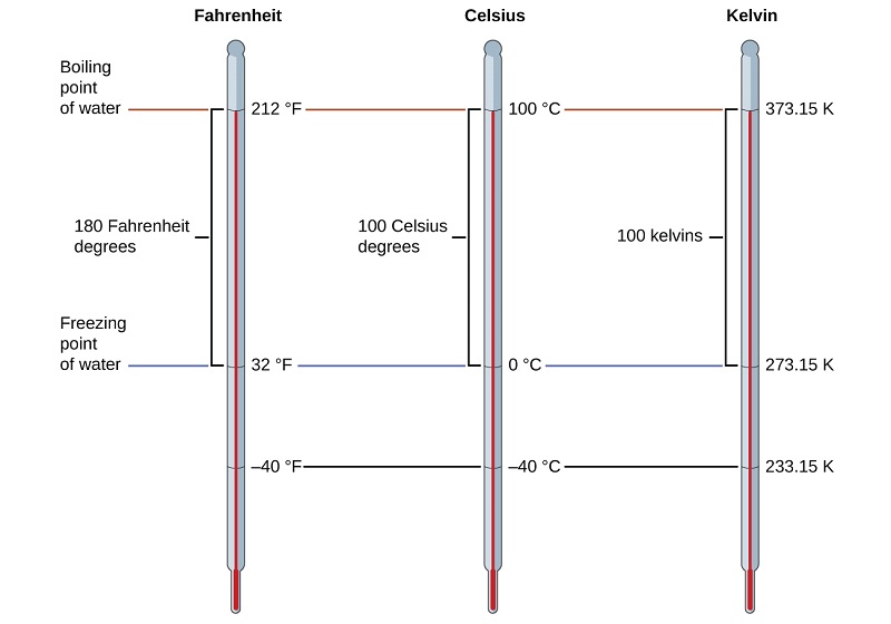 The Fahrenheit, Celsius, and kelvin temperature scales are compared. Image credit: OpenStax, Chemistry