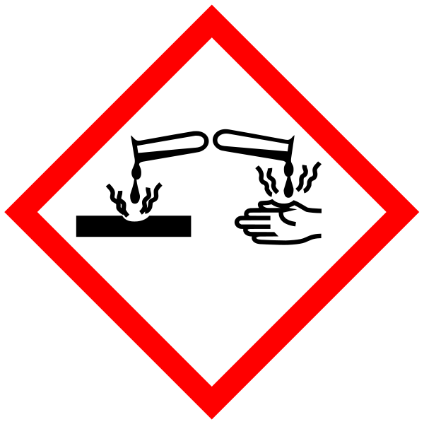 Corrosive. Chemicals with this label can burn your skin and eyes and burn holes in your clothes. An example is hydrochloric acid. |