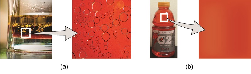 (a) Oil and vinegar salad dressing is a heterogeneous mixture because its composition is not uniform throughout. (b) A commercial sports drink is a homogeneous mixture because its composition is uniform throughout. Image credit:- (a) “left”: modification of work by John Mayer; (a) “right”: modification of work by Umberto Salvagnin; (b) “left”: modification of work by Jeff Bedford; (b) “right”: OpenStax, Chemistry