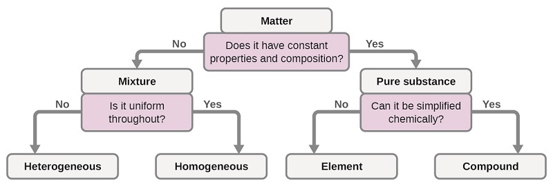 Depending on its properties, a given substance can be classified as a homogeneous mixture, a heterogeneous mixture, a compound, or an element. Image credit: OpenStax, Chemistry