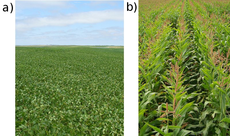 a) A soy bean field and b) a maize field. Crop rotation helps to restore nutrients in the soil.