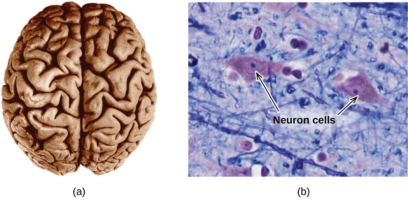 (a) A typical human brain weighs about 1.5 kg and occupies a volume of roughly 1.1 L. (b) Information is transmitted in brain tissue and throughout the central nervous system by specialized cells called neurons (micrograph shows cells at 1600× magnification). Image credit: OpenStax, Chemistry