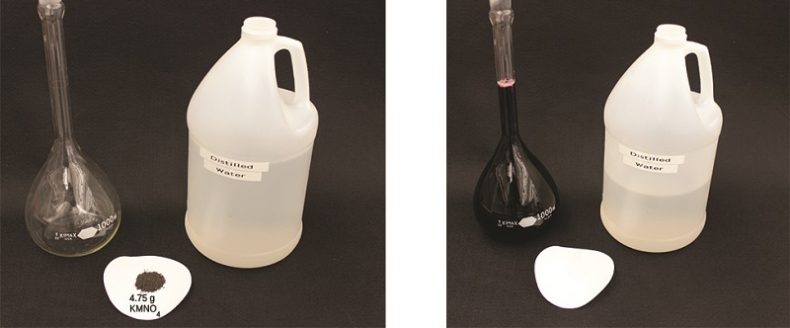 A solution of KMnO4 is prepared by mixing water with 4.74 g of KMnO4 in a flask. Image credit: modification of work by Mark Ott