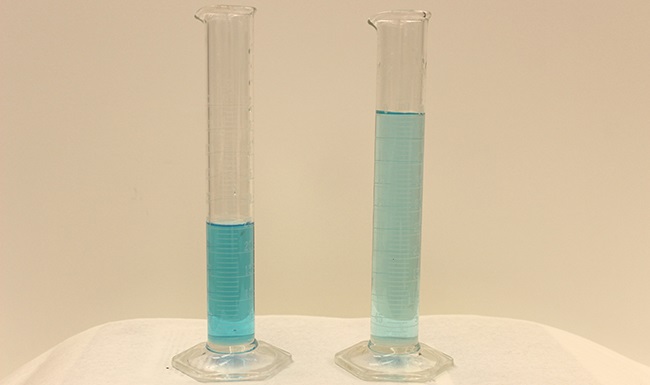Both solutions contain the same mass of copper nitrate. The solution on the right is more dilute because the copper nitrate is dissolved in more solvent. Image credit: Mark Ott
