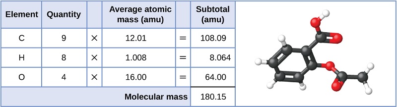 Likewise, the molecular mass of an aspirin molecule, C9H8O4, is the sum of the atomic masses of nine carbon atoms, eight hydrogen atoms, and four oxygen atoms, which amounts to 180.15 amu (see image below).