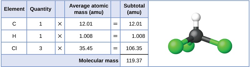 The average mass of a chloroform molecule, CHCl3, is 119.37 amu, which is the sum of the average atomic masses of each of its constituent atoms. The model shows the molecular structure of chloroform. Image credit: OpenStax, Chemistry