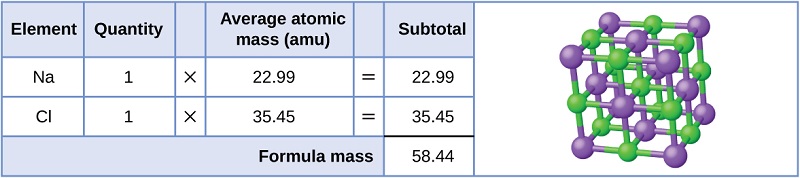 Table salt, NaCl, contains an array of sodium and chloride ions combined in a 1:1 ratio. Its formula mass is 58.44 amu. Image credit: OpenStax, Chemistry